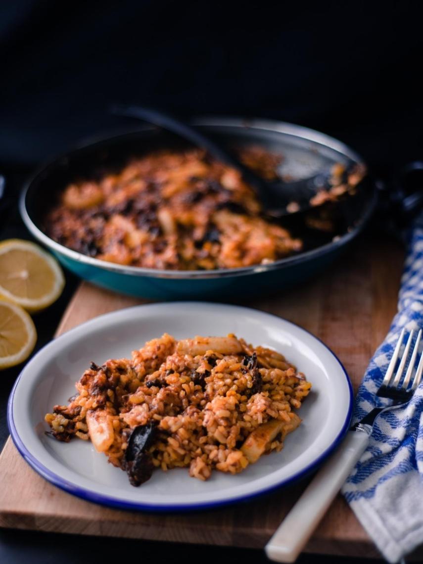 Ponemos la paellera sobre un salvamanteles y a comer directamente de ella. Si queréis ser algo más civilizados, como nosotros aparentamos para la fotografía, emplatáis y regáis opcionalmente con limón. El alioli, también complementario, le sienta de muerte a este tipo de arroces.