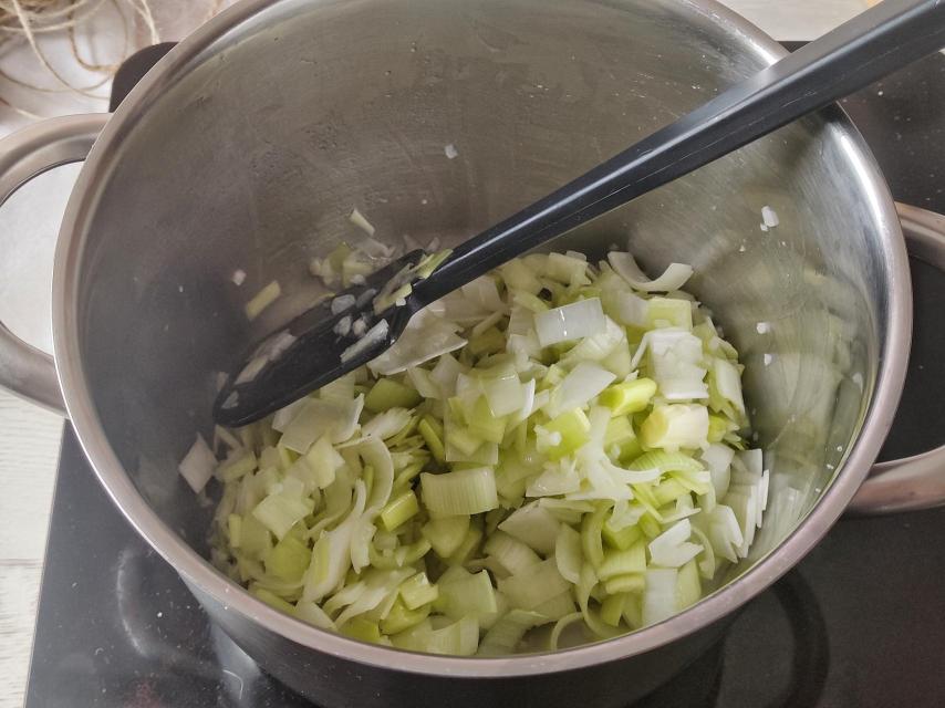 Para hacer el sofrito, picar finamente el puerro y la cebolla, lo más pequeños posible y en una olla - idealmente baja y ancha - empezar sofriéndolos con aceite y sal, a fuego suave, para que pochen bien, nos gustará incluso que empiecen a caramelizarse ligeramente tomando color. Reservar un poco de la parte verde del puerro bien picada para terminar el arroz con ello.