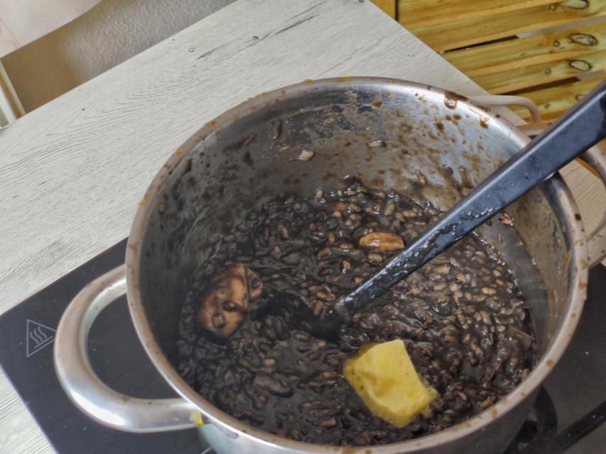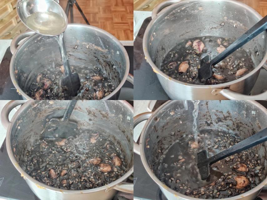 Incorporar un cazo de caldo caliente, bajar el fuego e ir removiendo de vez en cuando hasta que se absorba el líquido. Se trata de cocinar este arroz negro como si fuera un risotto, así que cuando se haya consumido el primer caso de caldo, añadimos el siguiente y repetimos el proceso hasta terminar con todo el caldo.