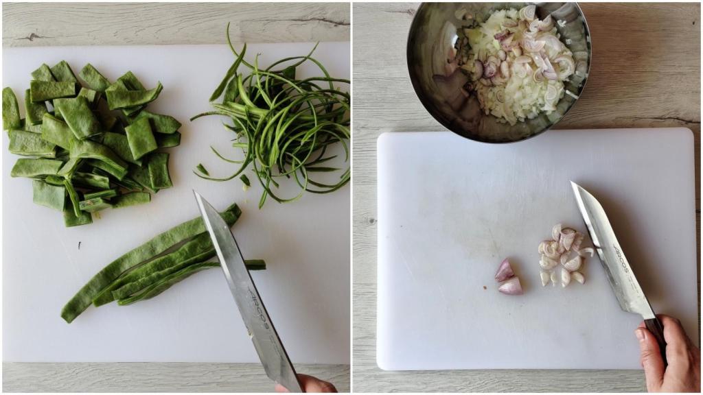 Pelar y cortar las puntas de la judía verde. Cortar en trozos de 2 cm y, de igual, forma, cortar en cuadrados pequeños la cebolla y la chalota.