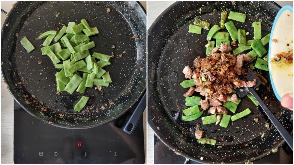 Añadir a la paella la judía verde y saltearla durante 1 minuto. Agregar la presa en cuadrados y la cebolla pochada.
