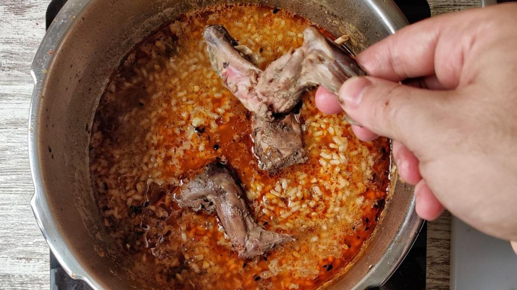 A falta de 3 minutos, añadir el conejo y rectificar la sazón si fuera necesario. Servir muy caliente.