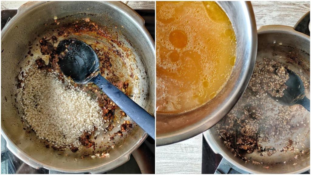 Pasado el tiempo, incorporar el arroz y rehogar un par de minutos a fuego bajo. Regar con el caldo que habíamos colado y que debe estar caliente. Dejar cocinar 18 minutos a fuego lento (si fuera necesario añadir un poco más de agua, se puede hacer siempre que ésta sea caliente).
