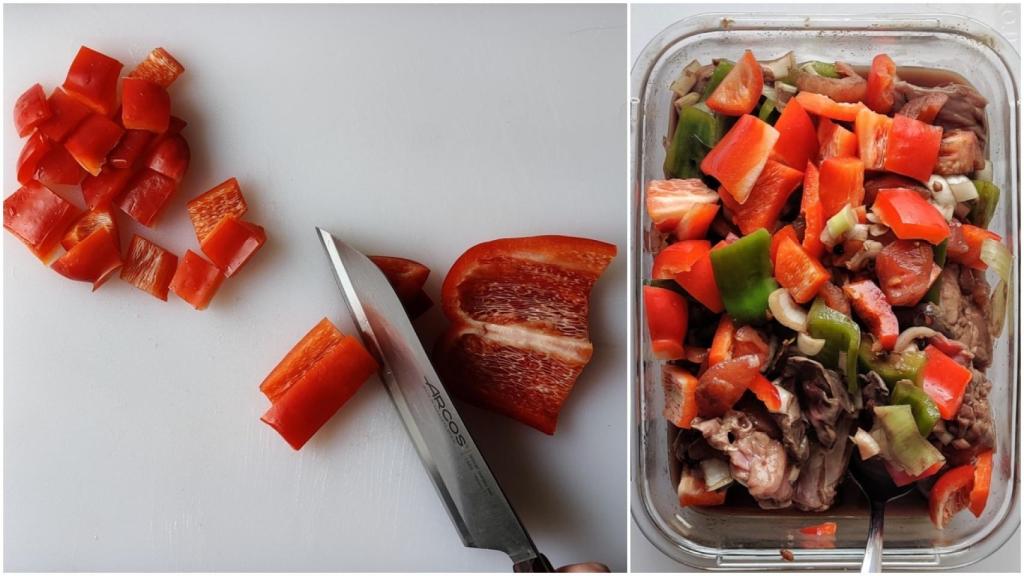 Una vez que tenemos el conejo en trozos, salpimentar y cortar el pimiento rojo, el pimiento verde y la cebolla en trozos medianos. Mezclar con el conejo en un recipiente ancho e incorporar el vinagre y el vino y las especias. Tapar con papel film y guardar en la nevera un mínimo de 12 horas. Se puede quedar hasta dos días completos.