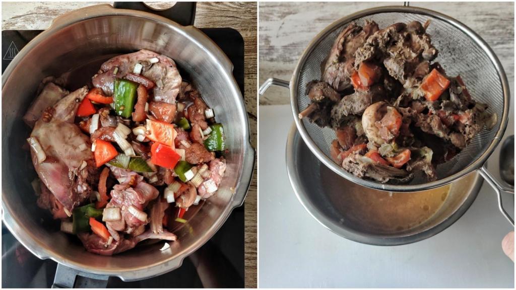 Al día siguiente, verter el conejo y la marinada en una olla. Agregar agua y dejar cocer con la olla exprés cerrada durante 15 minutos. Pasado el tiempo, colar y separar la carne de las verduras. Picar o aplastar hasta que se quede hecho una pasta. Reservar el caldo caliente.