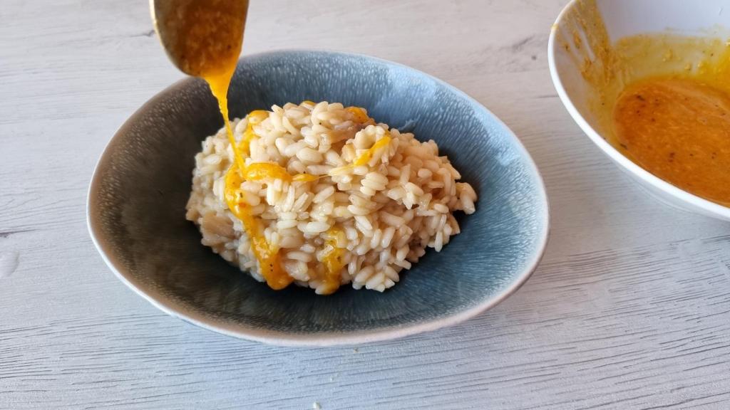 Emplatar el risotto carbonara terminando por encima con la crema de yema y queso, abundante, y con el resto de la papada crujiente. Si queremos, añadir más queso rallado por encima.