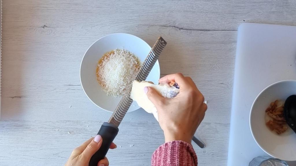 Poner a punto de sal y añadir abundante pimienta negra. Mientras que el arroz se cuece hacer la mezcla de la yema con los quesos rallados dejando 40 g de queso parmesano sin incorporar.
