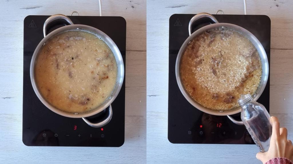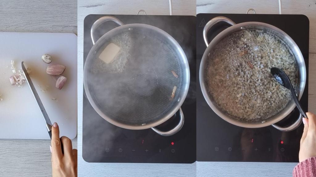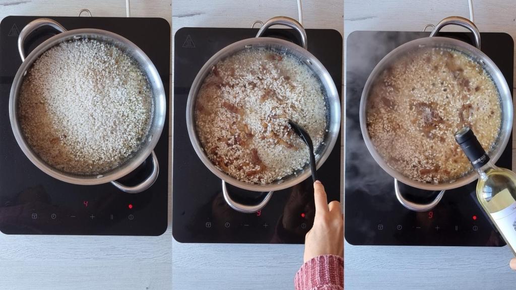 Cocinar el arroz con la chalota pochada.