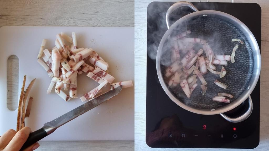 Trocear y saltear el guanciale.