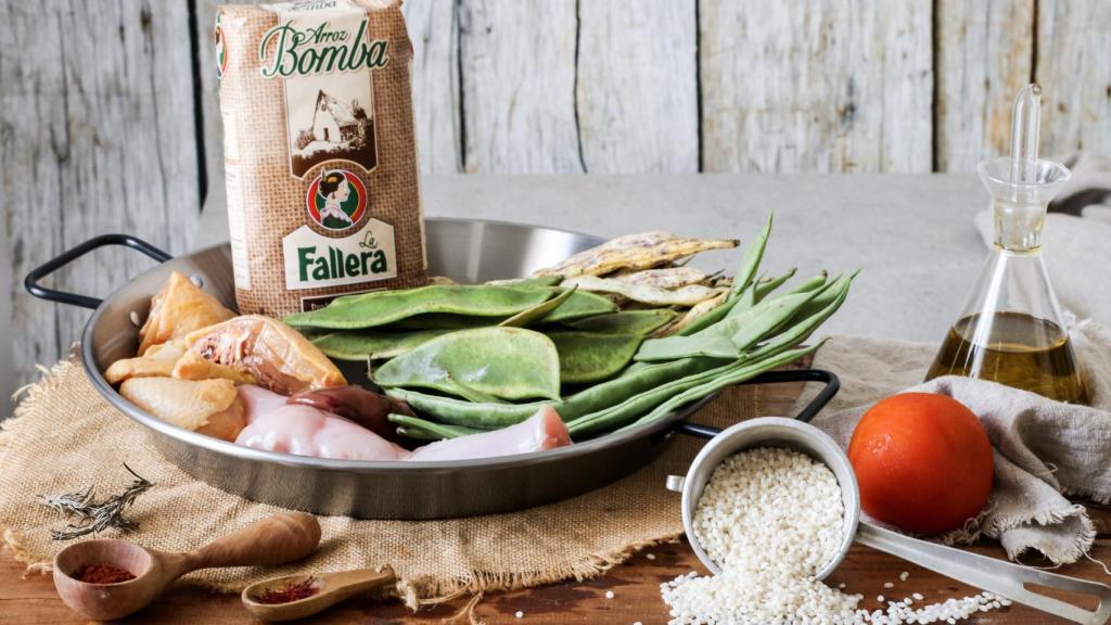 Los ingredientes básicos para preparar una auténtica paella valenciana, aparte de un arroz de máxima calidad como es La Fallera Bomba, son agua, aceite de oliva virgen extra, sal y azafrán en hebra, tomate y pimentón que son los que no pueden faltar. También lleva una cantidad moderada de pollo, conejo, bajoqueta o ferradura (judía verde plana) y de garrofó (judía blanca típica de la región). Cualquier otro alimento se considera un atentado contra las buenas costumbres de las paellas, sobre todo los guisantes y la cebolla cuya utilización les parece aberrante a los valencianos.