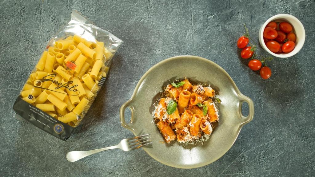 Para prepararla, el chef ha elegido los Rigatoni Nº 35 de Garofalo, una pasta de sémola de trigo duro elaborada bajo las normas de calidad de la IGP Pasta de Gragnano, trefilada en bronce y estriada, lo que le otorga una mejor adherencia a la salsa.