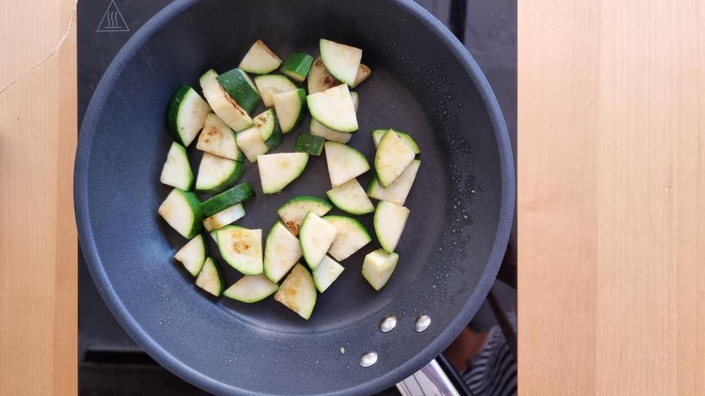 Saltear el calabacín a fuego medio, con el aceite de oliva, hasta que se dore por todas partes y se quede tierno. Añadir un poco de sal. Podríamos incorporar también un diente de ajo para que diese algo de sabor o un poco de aceite de ajo.