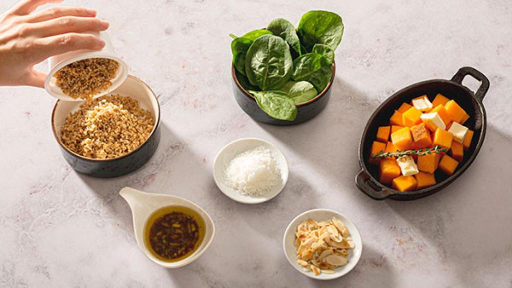 Cuando la calabaza casi esté lista (si es que no la hemos cocinado con antelación), es el momento de ir preparando el bulgur. Para ello, solo hay que abrir ligeramente el vasito de bulgur de Brillante y meterlo en el microondas durante un minuto. Cuando esté listo, lo sacamos con cuidado de no quemarnos, vertemos el contenido en el bol en el que vayamos a preparar la ensalada y dejamos que se atempere durante un rato.