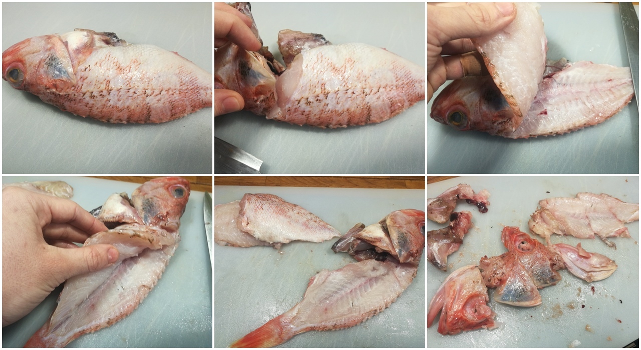 Deslomamos las cabras. Para ello realizamos un corte en diagonal a la altura de la agalla hasta las aletas superiores y por la parte superior del pescado pasamos un cuchillo muy afilado a ras de la espina para, poco a poco y con cortes pequeños y sucesivos, ir despegando el lomo de la espina central desaprovechando la menor cantidad de pescado posible. Un buen truco es que, antes de llegar a sacar el lomo de la cabra hasta el final demos la vuelta al pescado y marquemos el corte del otro lomo por lo menos hasta la mitad. Así, una vez saquemos el primer lomo, el segundo lo sacaremos mucho más fácilmente.