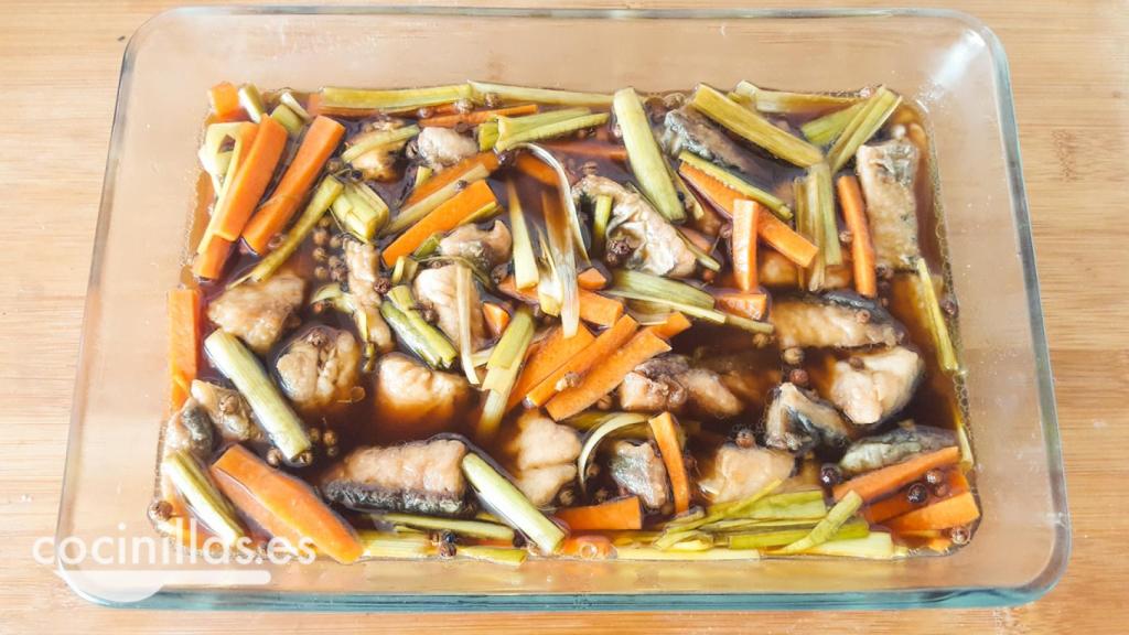 Es un escabeche que se prepara en frío en un momento, perfecto para aprovechar sobras de pescado frito que enseguida se resecan y que luego nadie se quiere comer.