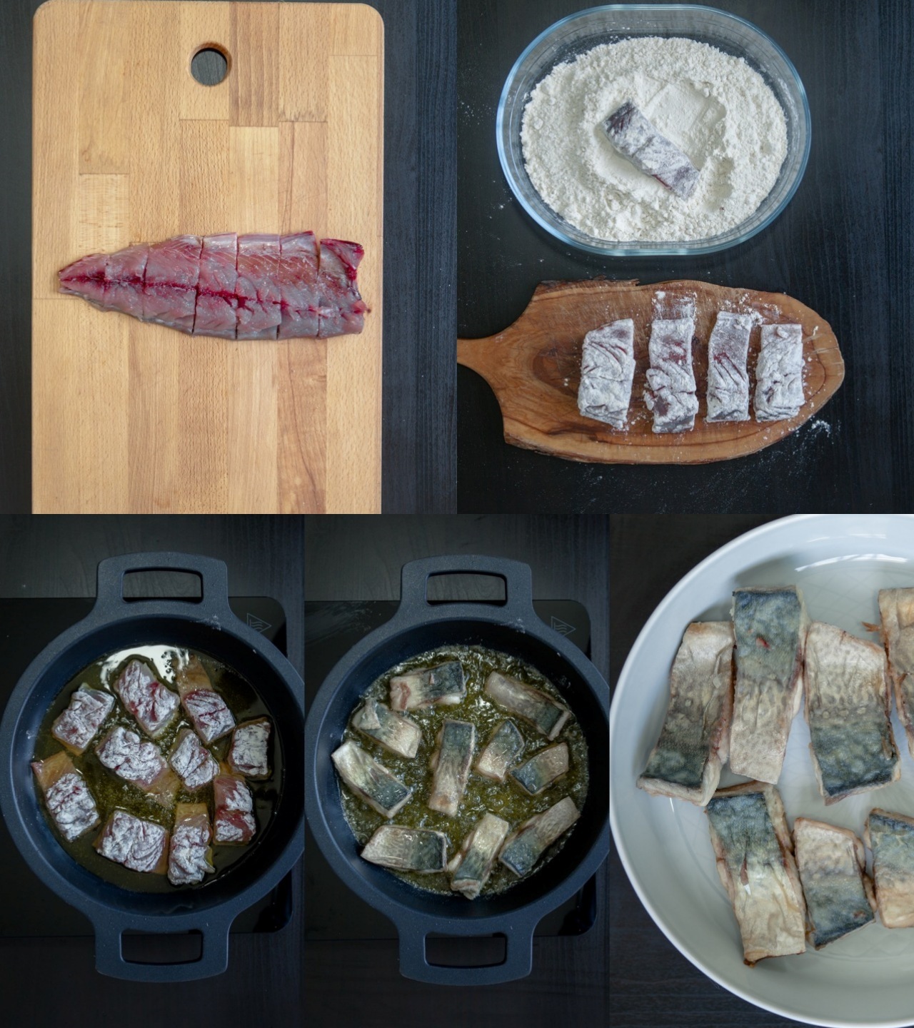 Si vamos a hacer mejillones en escabeche, los cocemos, retiramos las cáscaras y los dejamos enfriar. Si lo que vamos a hacer es un escabeche de pescado propiamente dicho, salamos el pescado y lo enharinamos. En una sartén ponemos a calentar el aceite de oliva virgen extra, a fuego medio porque no nos interesa que se nos queme, freímos los trozos de pescado y, cuando estén, los vamos dejando sobre un colador de malla metálica para que escurran el exceso de aceite.