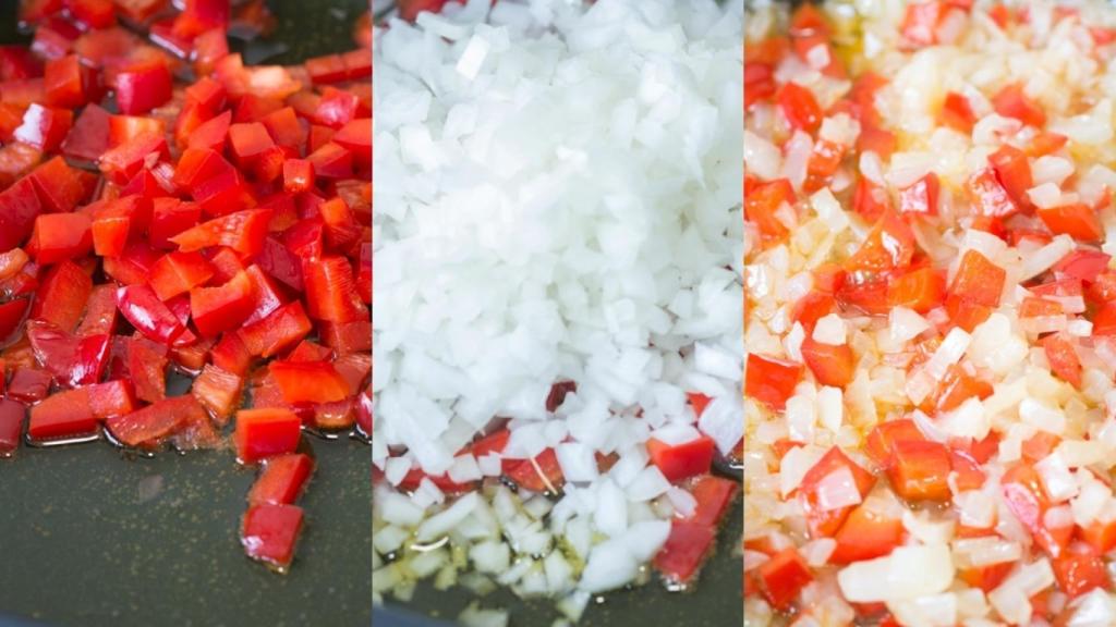 Picamos las cebollas y el pimiento en cubitos. En una sartén ponemos a calentar el aceite que hemos reservado de freír el pescado y sofreímos las cebollas y el pimiento con un poco de sal durante un par de minutos. Bajamos el fuego y las dejamos pochar hasta que estén casi tiernas. Serán unos 10-12 minutos.
