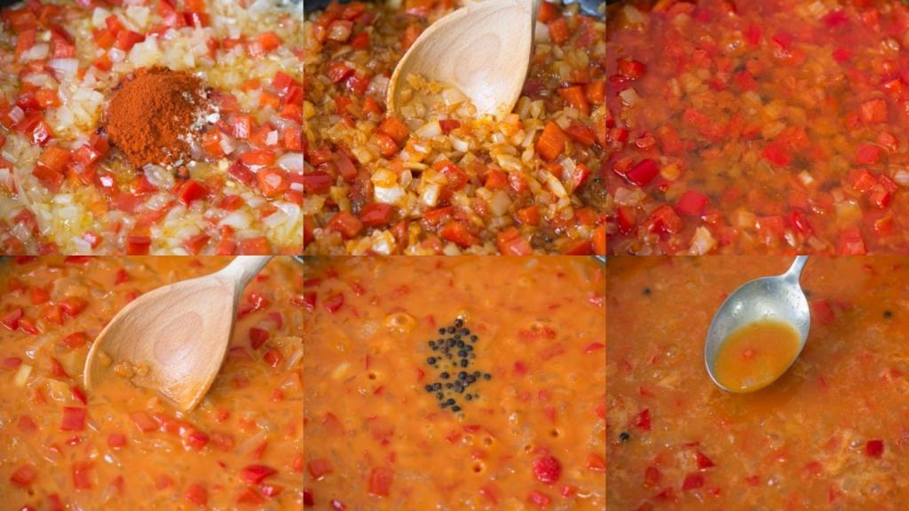 Cuando el sofrito esté listo, añadimos la harina y los pimentones, damos unas vueltas para que se integren bien y añadimos el vino blanco y el vinagre. Subimos el fuego al máximo y cuando empiece a hervir lo dejamos unos 5 minutos para que se evapore el alcohol.