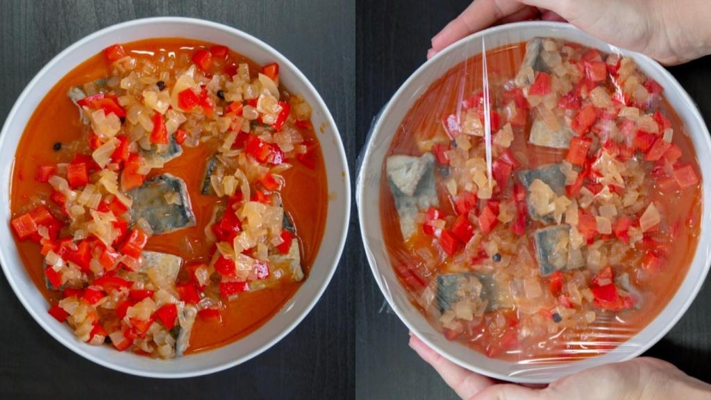 Dejamos enfriar el escabeche y los trozos de pescado frito. Cuando todo esté frío, ponemos los trozos sobre una fuente honda de vidrio, barro o porcelana, cuidando que queden amontonados. Cubrimos con el escabeche y guardamos en la nevera tapados con papel film hasta el momento de consumir.