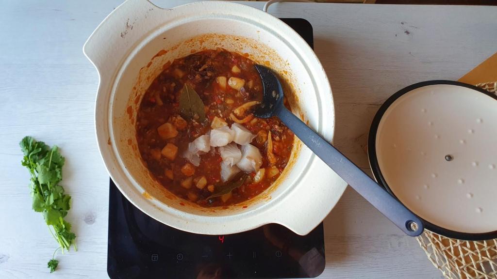 En el último minuto añadir el bacalao troceado y apagar el fuego, tapar y dejar reposar 5 minutos antes de servir condimentando con abundante cilantro fresco.