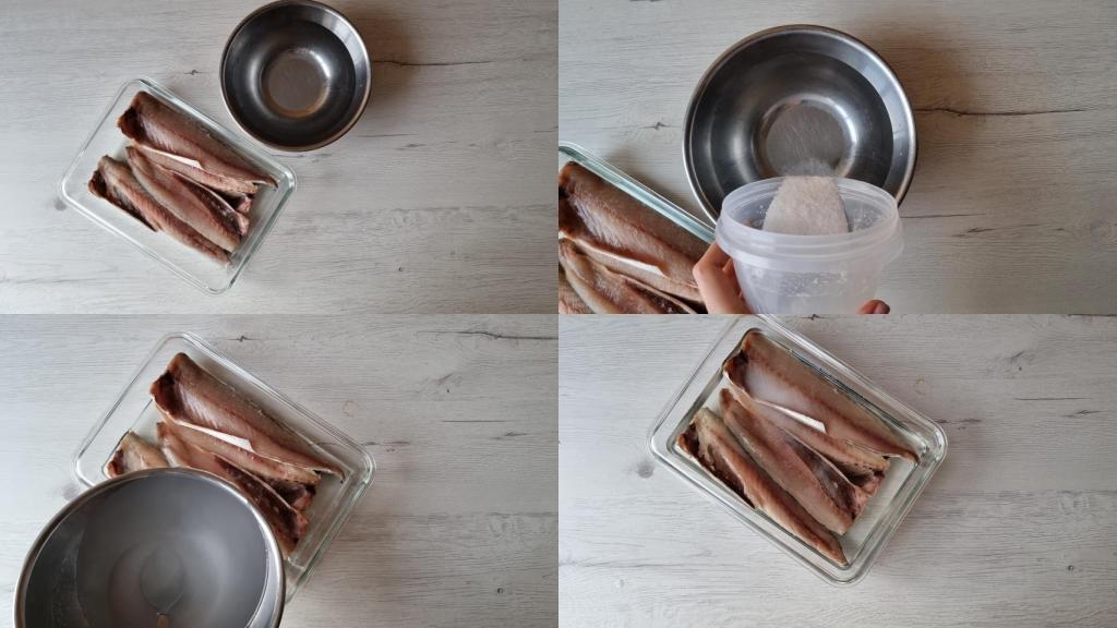 Una vez congelados los lomos de caballa, descongelar durante 24 horas en la nevera. Mezclar el agua con la sal y el azúcar y cubrir los lomos de caballa completamente con esa salmuera. Dejar actuar durante una hora y media.