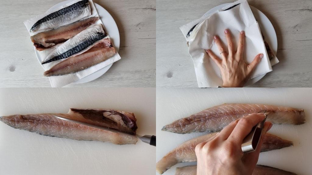 Tras este tiempo, sacar las caballas, limpiar con agua y secarlas muy bien con la ayuda de papel de cocina. Limpiar bien quitando la zona de la ventresca y las partes duras. Con paciencia limpiar los lomos de espinas utilizando unas pinzas. Esto puede no ser necesario, pero será de gran ayuda luego para comer fácil.