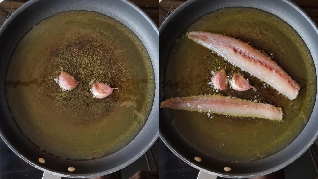 Calentar un poco de aceite en una sartén grande, añadir los ajos simplemente machacados un poco, con su piel y todo, y cuando empiecen a bailar freír las caballas sólo por el lado de la piel, regándolas con aceite por el otro lado. Con un minuto será más que suficiente. Retirar a un plato.