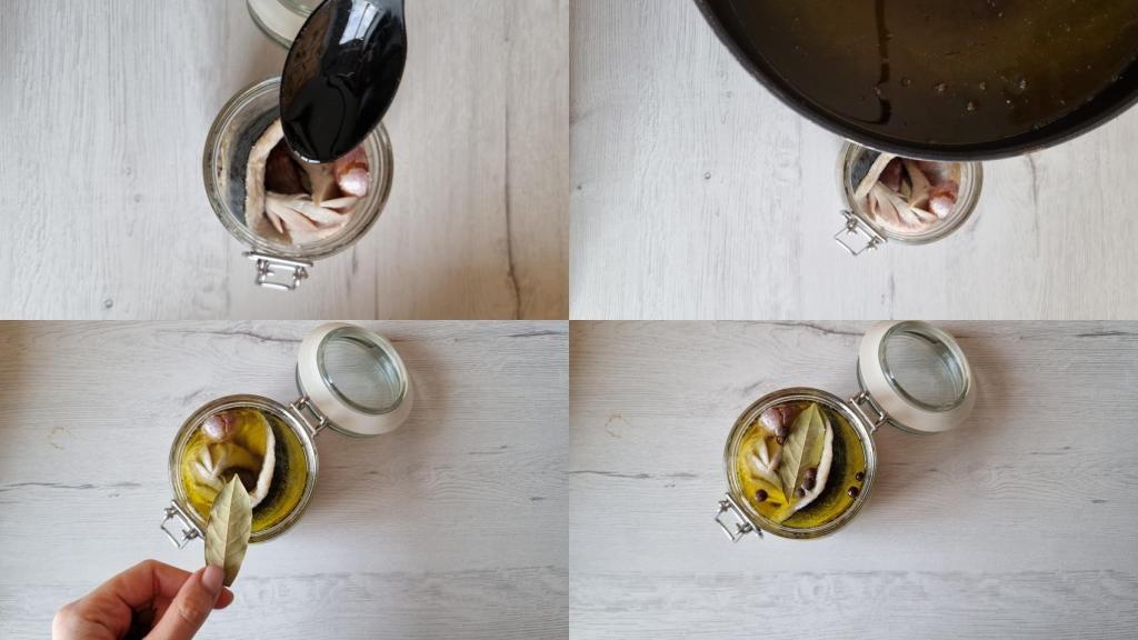 Introducir las caballas en los botes, añadir también la pimienta, el laurel y los ajos fritos y cubrir con el aceite hasta arriba. Añadir unas gotas de vinagre. Cerrar bien el bote y darle la vuelta.