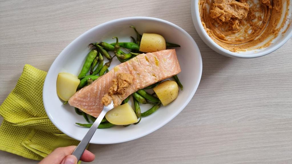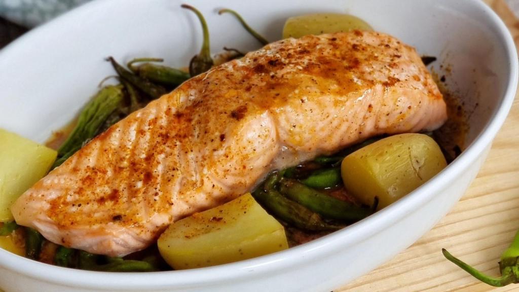 Espolvorear con un poco más de la mezcla de las especias si se desea y dejar reposar un par de minutos antes de servir. Retirar el salmón y mezclar las patatas y las piparras con lo que quede en la bandeja para que se impregnen de todo el sabor.