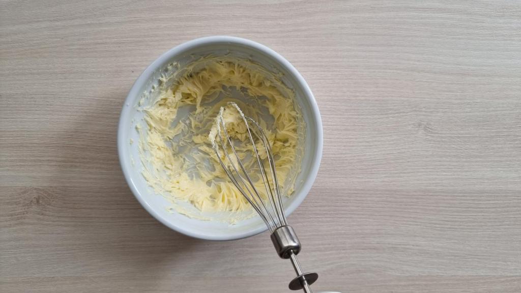 Batir la mantequilla, que tendrá que estar a punto pomada, con la ayuda de unas varillas hasta conseguir blanquearla y que quede esponjosa. Como si se montara.