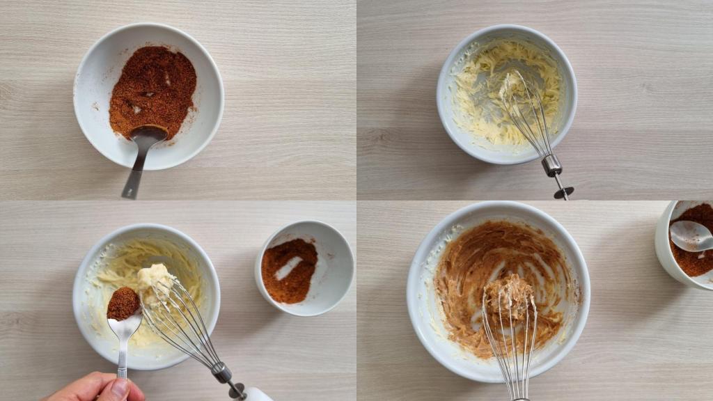 En un bol, mezclar todos los ingredientes del condimento. Añadir a la mantequilla dos cucharadas de las especias (al gusto de cada uno, si queremos que sea más potente sólo habrá que añadir más especias. Incorporar también la miel y batir muy bien.