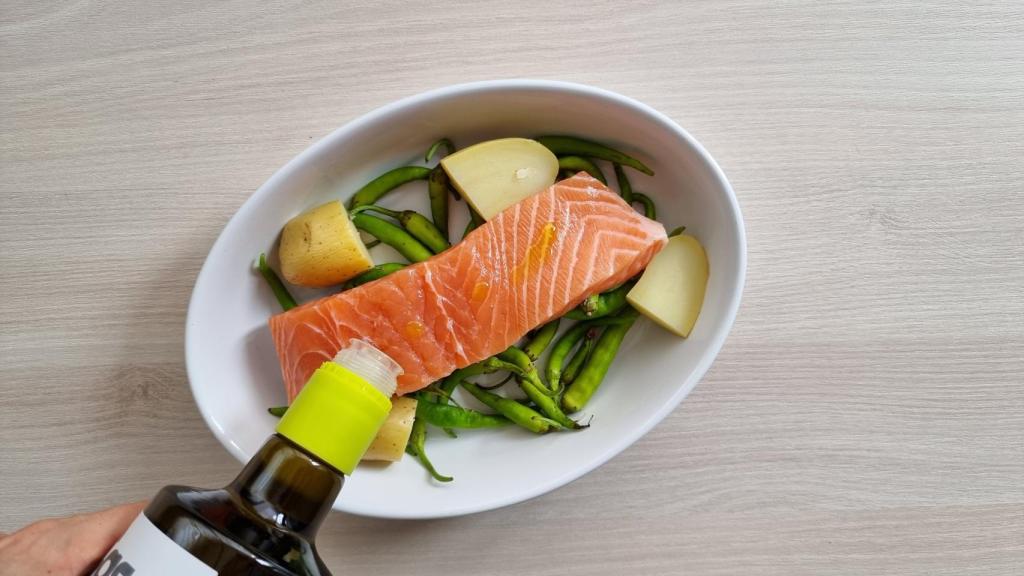 Trocear las patatas baby hervidas previamente, y enfriadas, y disponerlas en el fondo de la bandeja de horno junto con las piparras. Untar el salmón con un poco de aceite de oliva y añadir un poco de sal y disponerlo sobre la bandeja con la piel hacia abajo.