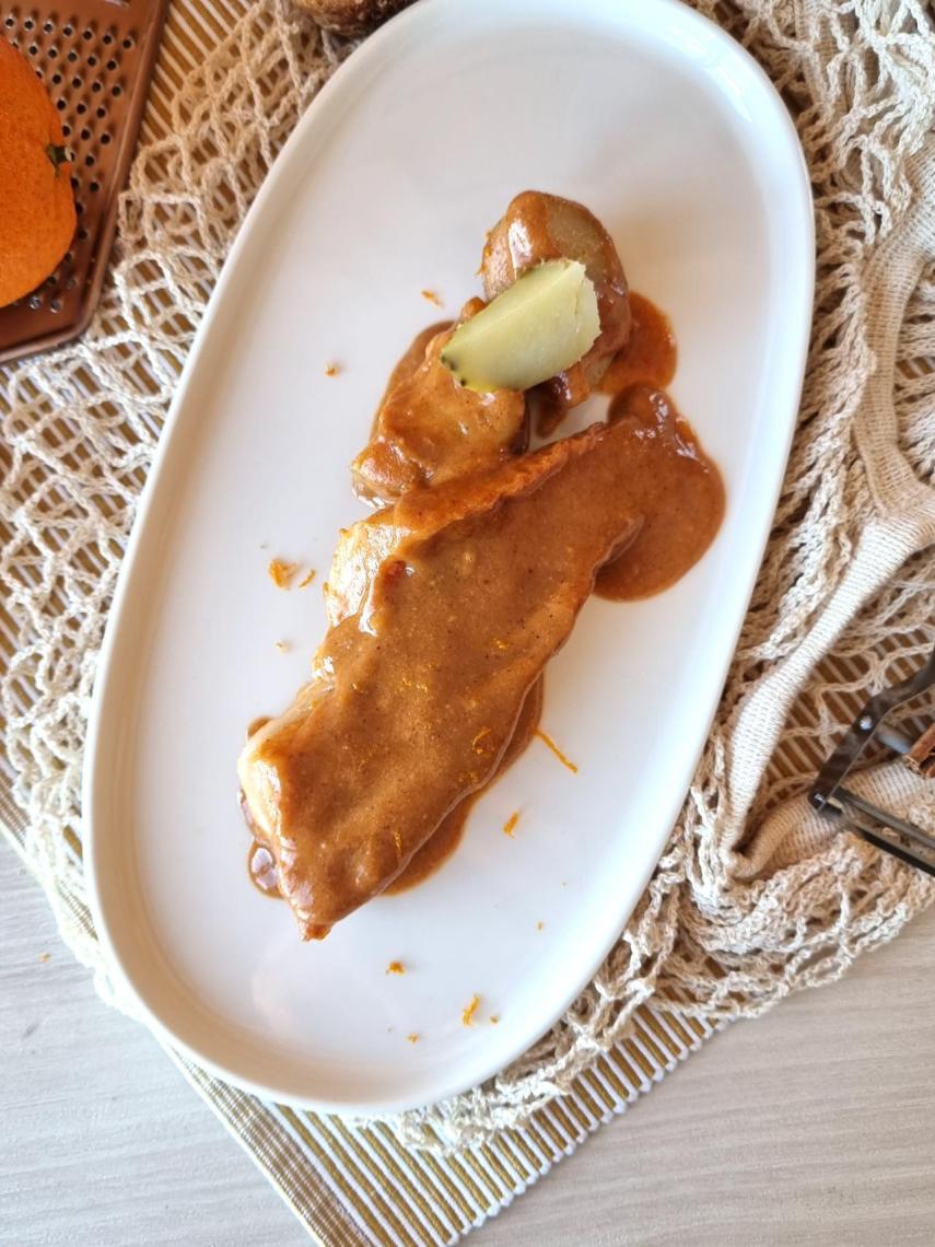Para preparar la salsa al pimentón, como ya se ha dicho, se parte de ese majado de pan y ajo al que se agrega el pimentón que le da nombre y también un poco de vinagre. Se tritura junto con un poco de carne de pimiento choricero y del caldo de pescado y se devuelve a la sartén para dejar que reduzca todo. El toque final se lo pone la ralladura de naranja. Hay también recetas que emplean un poco de cebolla pochada, pero si no se quiere se puede prescindir de ella perfectamente.