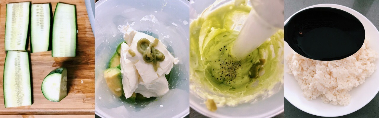 Lavamos el pepino, lo cortamos por la mitad y luego hacemos rodajas finas. En un bol incorporamos el aguacate, el queso crema, el zumo de limón, el Wasabi y salpimentamos al gusto. Con un procesador de alimentos manual lo con la batidora lo trituramos hasta obtener una mezcla homogénea.  Cocinamos el arroz en el microondas durante 2 minutos como lo indica las instrucciones del envase, dejamos enfriar durante 3 minutos. Ahora lo volcamos en un bol, sazonamos con un poco de sal, añadimos el vinagre y removemos hasta mezclarlo todo muy bien.