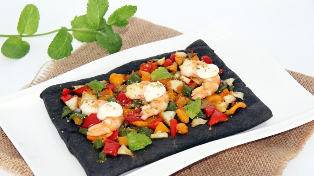 Coca negra de tinta de calamar con verduras y langostinos con Thermomix
