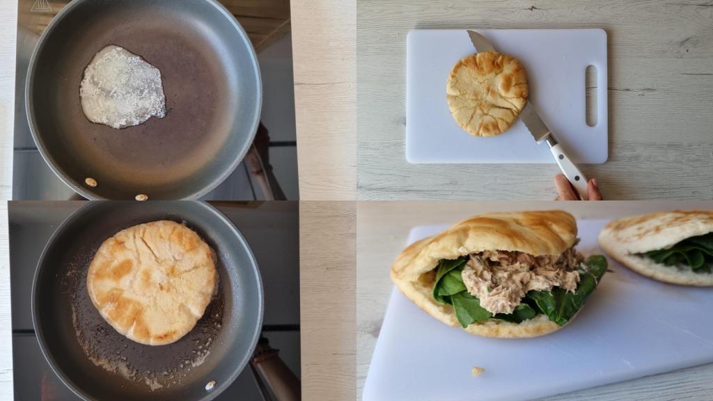 En una sartén con un poco de mantequilla tostar los panes de pita ligeramente y, con mucho cuidado de no quemarnos, abrirlos bien. Rellenar con las espinacas ligeramente condimentadas con aceite y sal, añadir la mezcla de atún y terminar con un huevo partido por la mitad justo en el momento de ser introducido en el pan, para que la yema quede dentro completamente. Añadir primero un poco de sal al huevo.