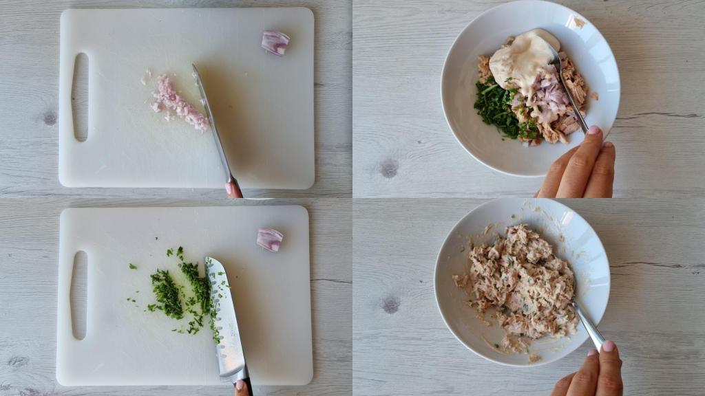 Pelar y picar la chalota muy finamente, picar también el perejil, las alcaparras y el apio, todo muy pequeñito. Escurrir el atún de la lata muy bien y mezclarlo con todo lo demás, añadir si se quiere un poco de picante al gusto de cada uno. Conseguir una mezcla untuosa y no líquida, añadir la cantidad de mahonesa que le guste a cada uno.