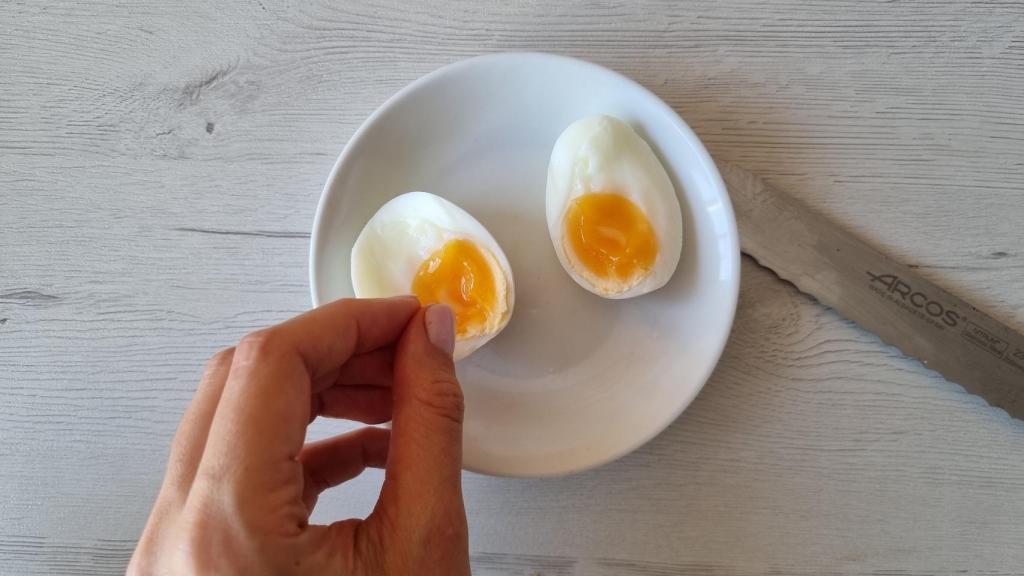 Escurrir los huevos del agua hirviendo cuando hayan pasado seis minutos. Es tremendamente aconsejable poner un cronómetro para que no se nos pase el tiempo. Retirar los huevos al agua fría con hielo para que se enfríen rápidamente. Cuando los huevos ya estén bien fríos al tocarlos pelarlos con mucho cuidado porque estarán muy tiernos por dentro, reservar.