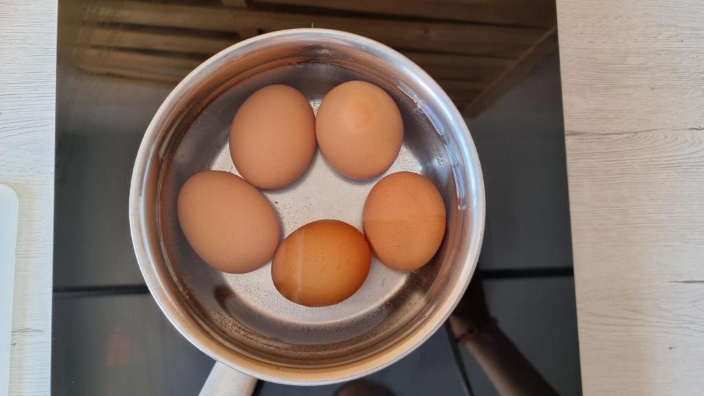 Poner a calentar agua abundante en un cazo. Cuando rompa a hervir, con mucho cuidado introducir los huevos y bajar el fuego para que se cocinen con hervor pero sin muchos borbotones para que la cáscara no se raje. Preparar un bol con agua fría con hielo.