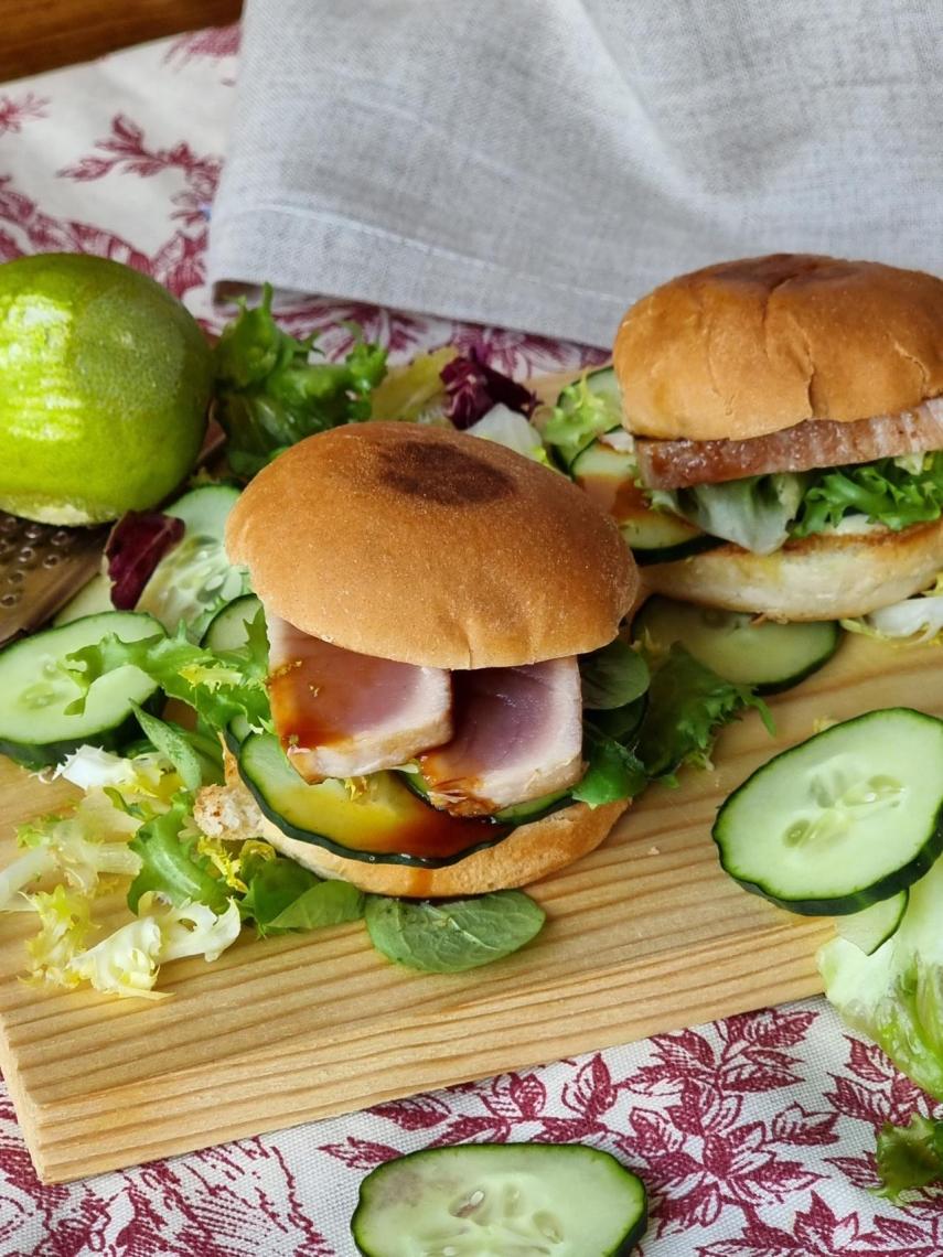 Laminar el bonito haciendo lonchas de 3 - 4 milímetros de grosor. Montarlo todo poniendo un poco de la mayonesa con mostaza en la base del pan, encima el pepino finamente loncheado, la lechuga y terminar con las láminas de bonito. Regar por encima con un poco de salsa tonkatsu, rallar un poco de lima que aportará frescor al conjunto y terminar con la otra parte del pan.