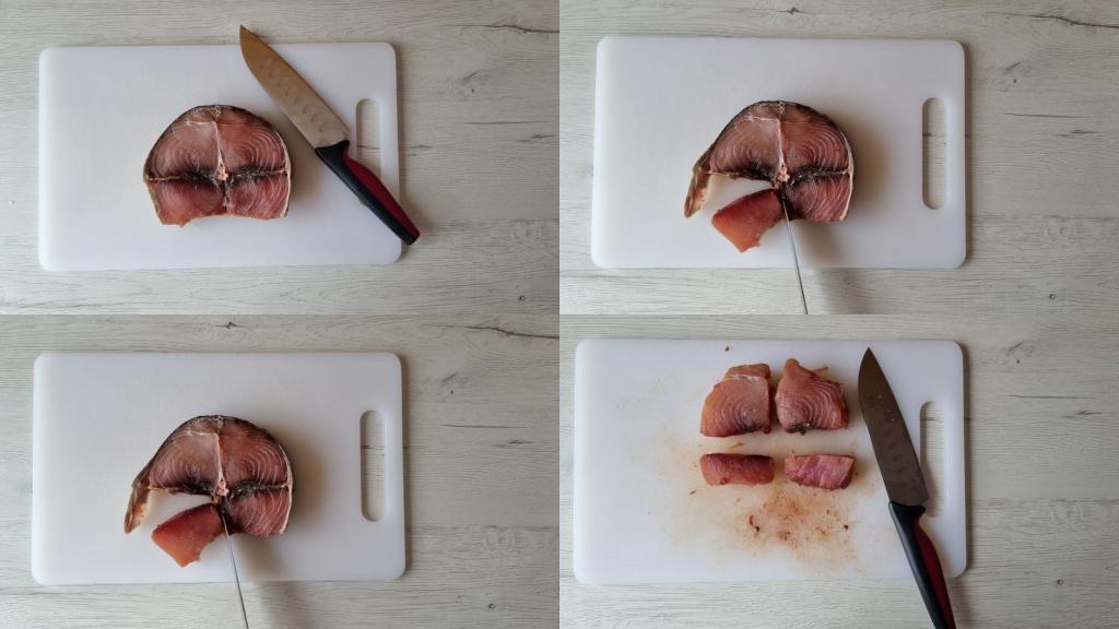 Descongelar el bonito durante 24 horas en la nevera. Quitar las espinas centrales y también las pieles externas. Hay que quedarse con los medallones limpios sin espinas.