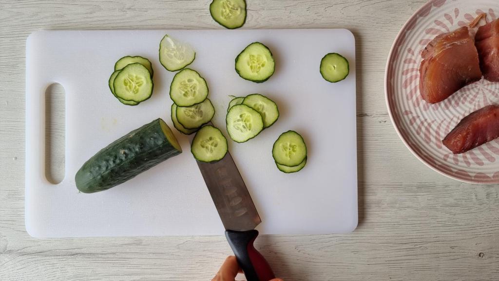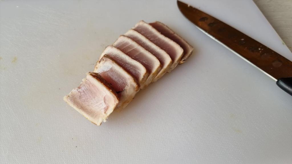 Se podría plantear la preparación como para la hamburguesa de caballa, haciendo una farsa con el bonito picado y pasándola por la plancha como una hamburguesa tradicional. Pero en esta opción de montadito se aprecia mejor el pescado al natural y además nos evita pasos intermedios con lo que es más rápido de hacer. Lo que sí es muy recomendable es congelar el bonito previamente para no tener sustos con el anisakis.
