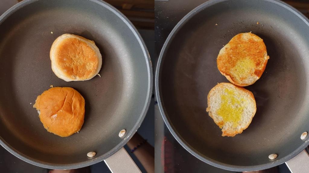 Partir los panes de hamburguesa por la mitad y tostarlos en la sartén con unas gotas de aceite de oliva, tanto por fuera como por dentro.