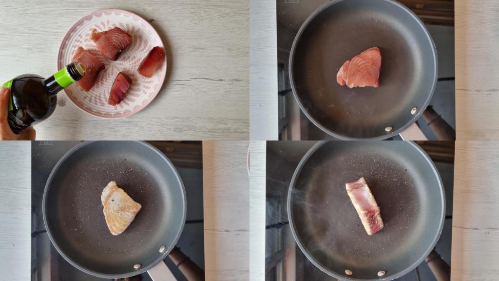 Untar el bonito con aceite de oliva virgen extra, añadir un poco de sal y pimienta negra. Calentar una sartén antiadherente a fuego máximo y marcar el bonito por todos sus lados, durante 30 segundos aproximadamente por cada lado. El objetivo es que se dore por fuera pero que no se haga por dentro. Cuando esté listo, llevar a una tabla y dejar reposar.