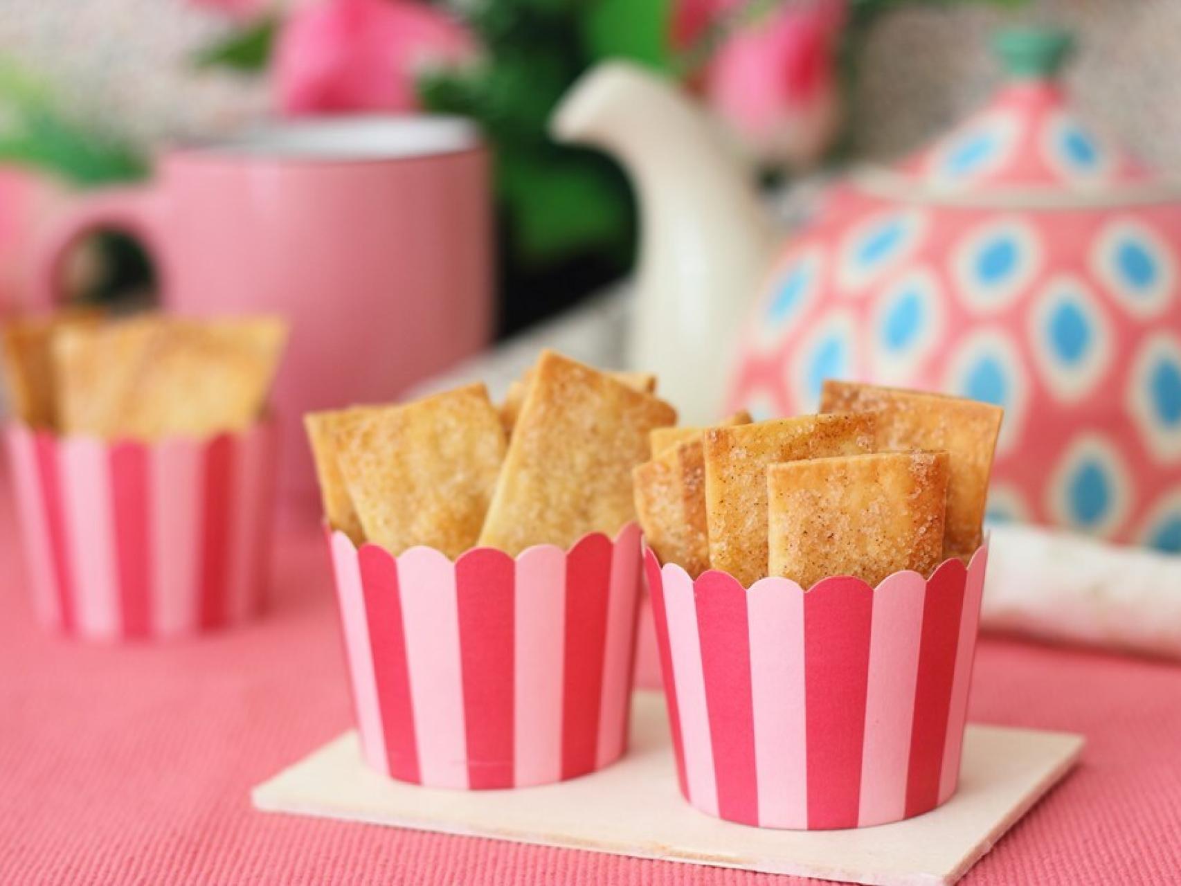 - Cortamos las tortillas de trigo en rectángulos, las ponemos sobre una bandeja forrada con papel de horno y las pintamos con la mezcla de mantequilla, azúcar y canela.