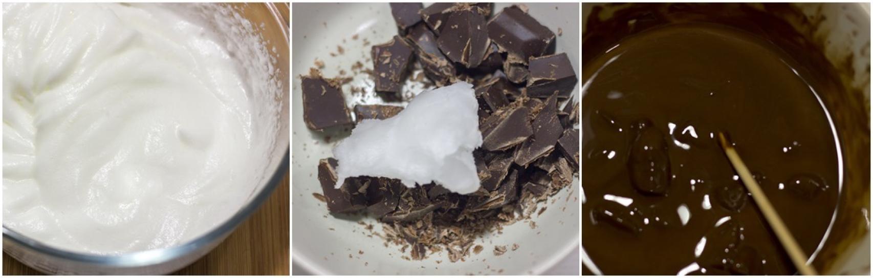 Troceamos el chocolate en un cuenco, lo mezclamos con la mantequilla -yo he usado aceite de coco, por eso el pegote es blanco- y lo fundimos en el microondas en dos tandas de 20 segundos a 800 W. Lo sacamos y seguimos removiendo para que los trocitos de chocolate que queden se fundan con el calor residual.