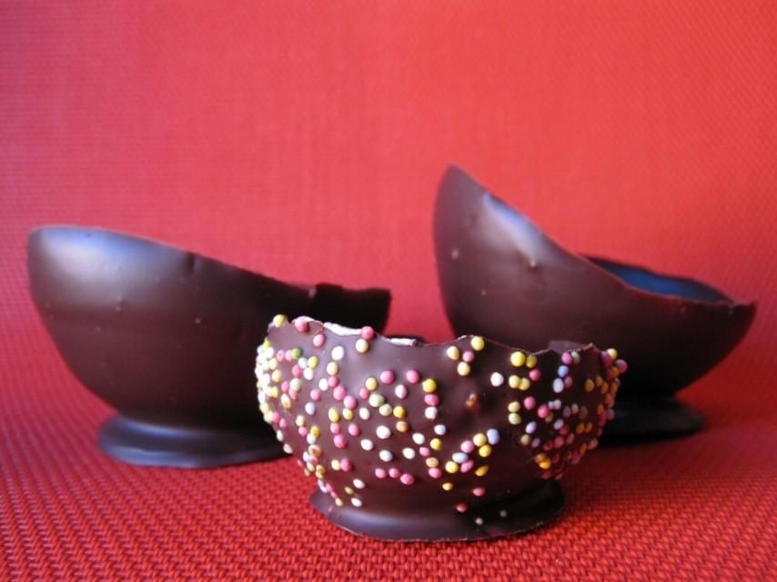 Puedes rellenar las copas de chocolate de lo que quieras, unas fresas, unos trozos de fruta fresca, un poco de nata o las natillas que te sobraron del túper de tu madre, porque la gracia de esto está en que nos vamos a comer hasta el recipiente, que para eso es de chocolate y está riquísimo.