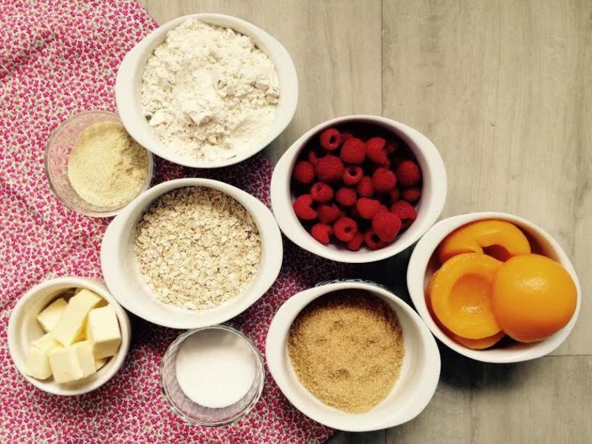 Aprende cómo preparar un delicioso crumble de melocotón y frambuesas que es un postre perfecto para preparar en un día de fiesta.