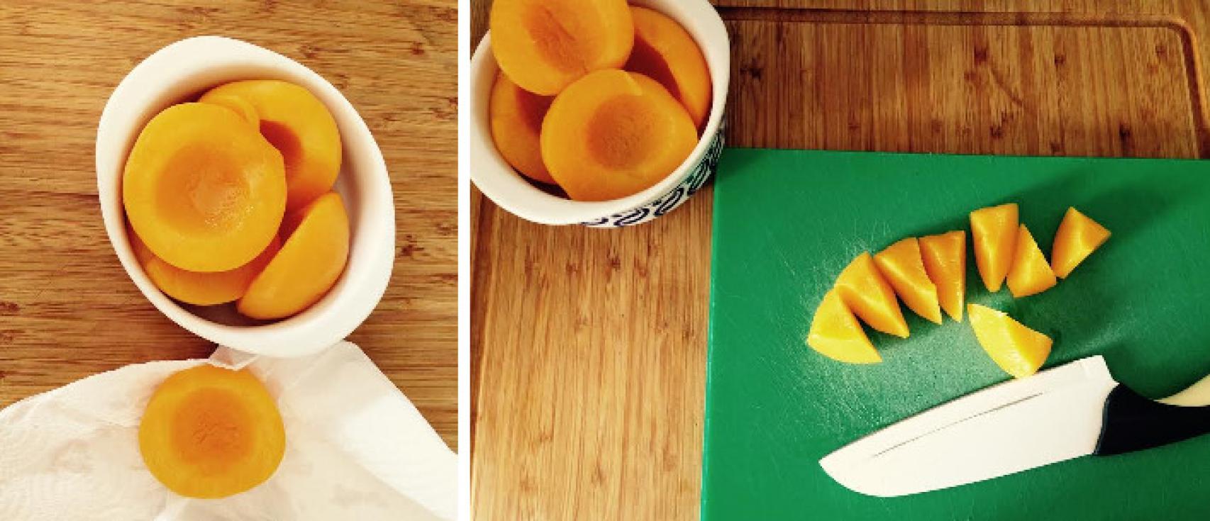Antes de empezar precalienta el horno a 190ºC, después lava las frambuesas y seca bien los melocotones. Corta el melocotón en trozos de unos 2 cm.