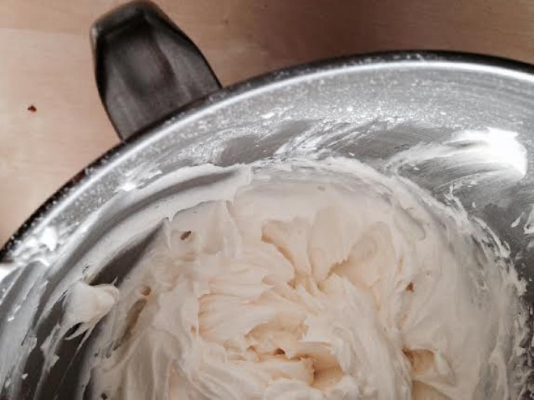1. Primero bate la mantequilla y ve añadiendo poco a poco el azúcar glas con la ayuda de unas varillas eléctricas a velocidad baja al principio y una vez este todo integrado sube la velocidad, hasta que quede todo bien incorporado.